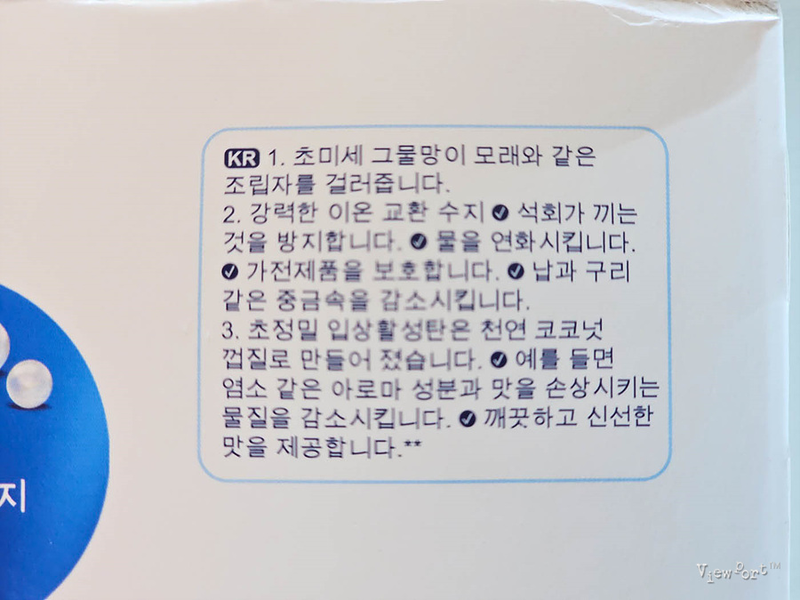 이 밖에 필터의 주요 기능은 물을 연화시키고 중금속을 감소시키고 그리고 여기 들어있는 활성탄은 천연 코코넛 껍질로 만들어서 보다 친환경적이라고 해요