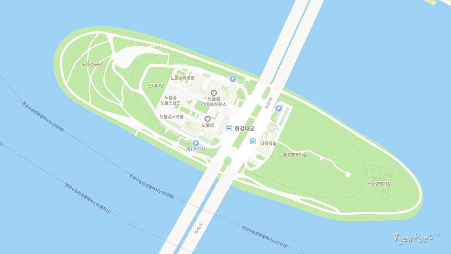 노들섬은 한강대교를 따라 한강 가운데 있는 작은 섬인데요, 이와 같이 한강 다리와 연결되어 있는 한강 섬으로 양화대교와 연결된 선유도 공원, 그리고 한강대교와 연결된 노들섬이 있습니다 (서강대교 아래에 있는 밤섬은 생태 경관 보존 지역으로 사람이 접근할 수 없게 되어 있어요)