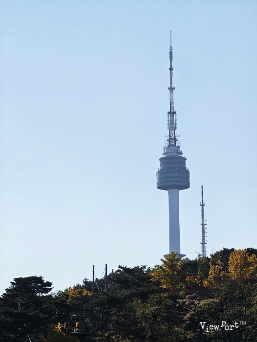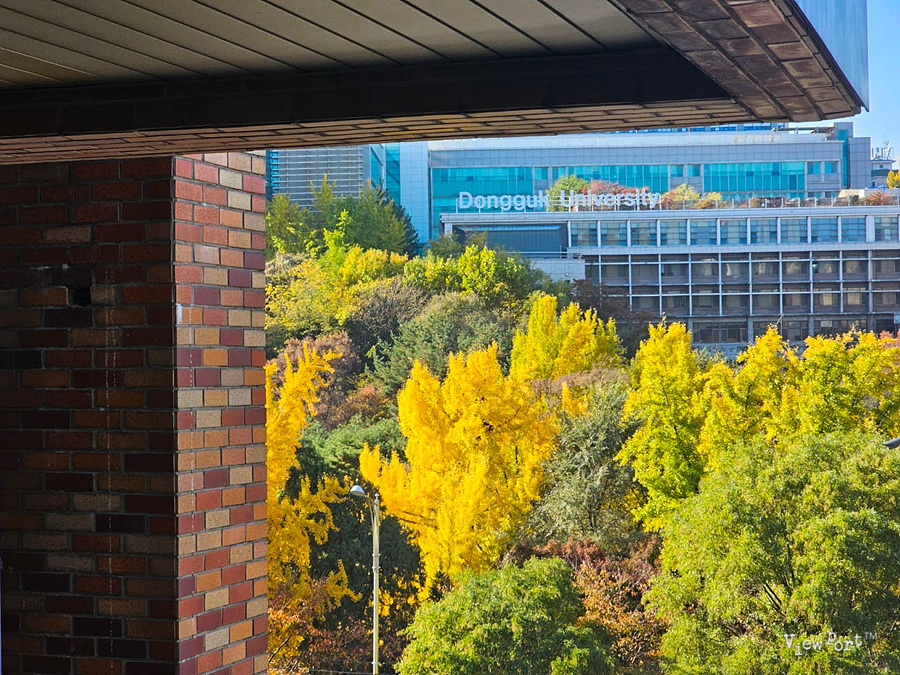 저 너머로 남산의 단풍과 장충단 공원 건너편 동국대학교에 교정, 그리고 남산타워가 우뚝서 있는 있는 남산의 정상을 볼 수 있습니다.