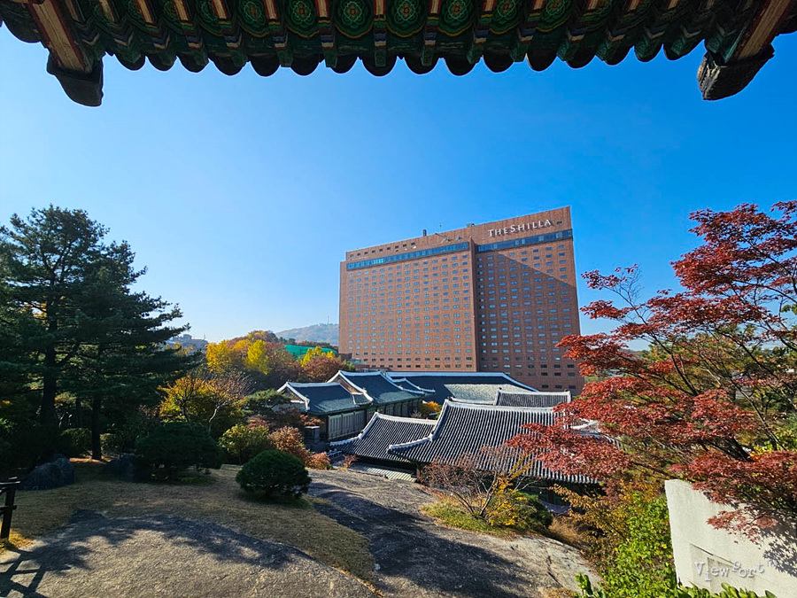 바위 언덕 위로 좁은 계단을 따라 올라가면 정자가 하나 보이는데요,이 정자 너머로 신라호텔 주변의 경관이 보입니다.