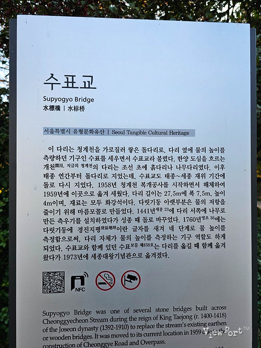수표교는 청계천을 가로질러 쌓은 돌다리로 다리 옆에 물의 높이를 측량하던 기구인 수표를 세우면서 수표교라고 불렸습니다 1958년 오염된 청계천 복개공사를 하면서 다리가 해체되어 1959년 이곳으로 옮겨졌습니다.