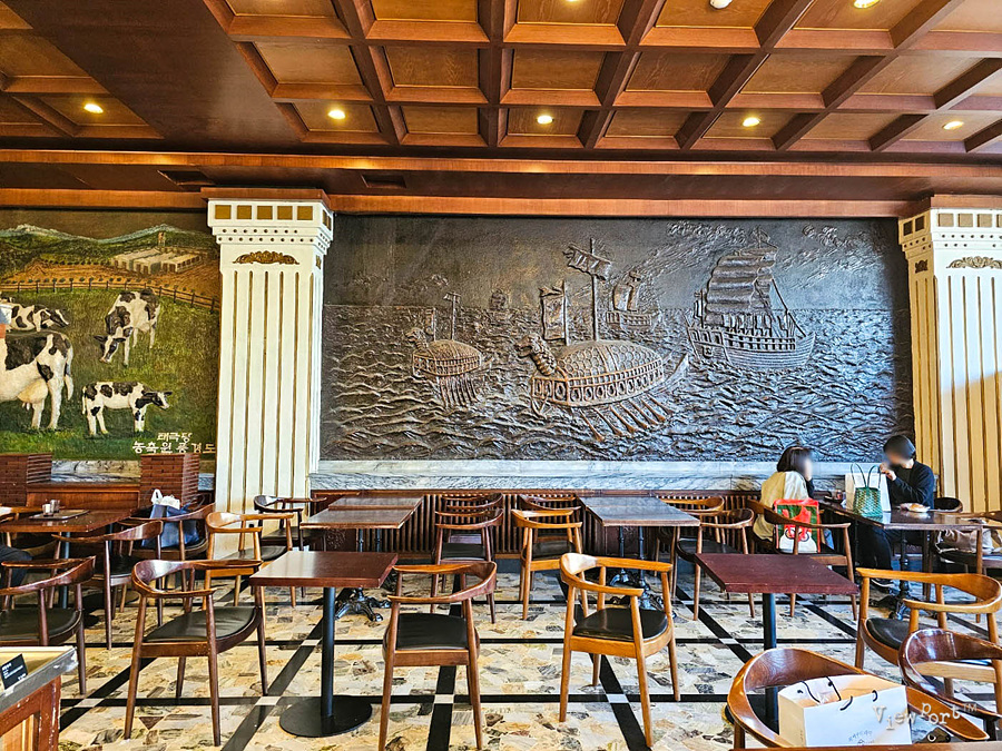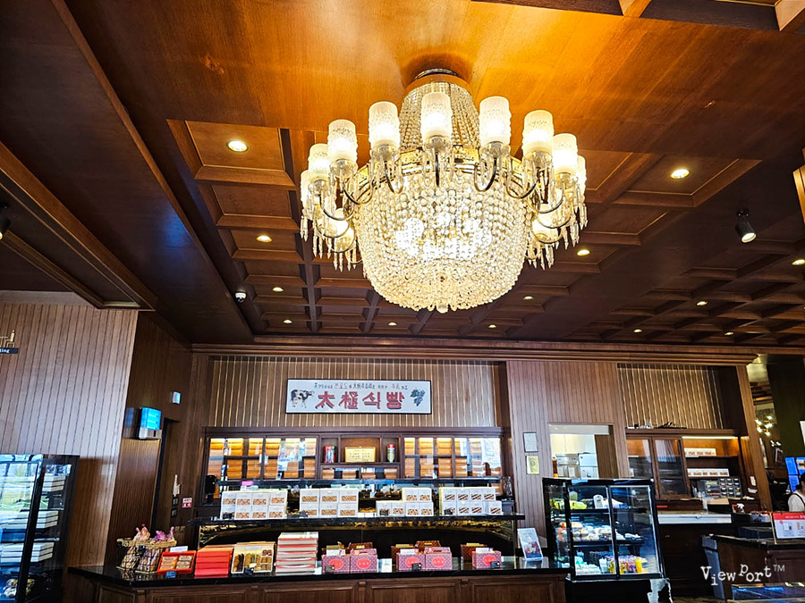 정말 정말 예전에 태극당 모습이 그대로 남아 있네요. 커다란 샹들리에와 목장과 임진왜란 때 거북선이 활약하는 모습을 담은 벽면의 그림과 투박한 글씨로 한자가 섞인 태극 식빵이란 글씨, 그리고 몇 십년전은 된듯한 빵을 놓은 선반들까지 말이죠