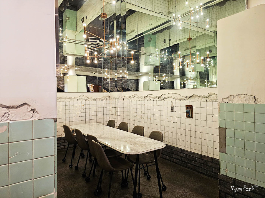 안쪽에 빵과 커피를 먹을 수 있는 공간이 있는데 저쪽 공간도 예전 타일과 유리가 붙어 있는 모습을 그대로 남겨 두었어요