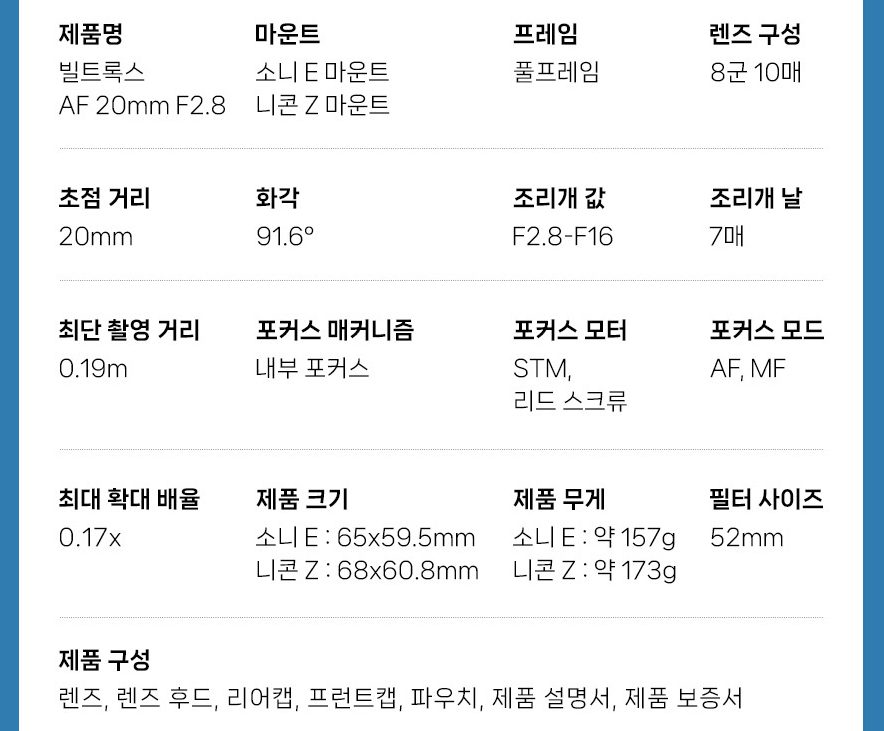 빌트록스에 AF 20에 f2.8 FE 마운트 렌즈인데요, 소니 디바이스의 장점은 풀바디 렌즈 FE 마운트도 크롭바디 E마운트에 사용이 가능합니다.