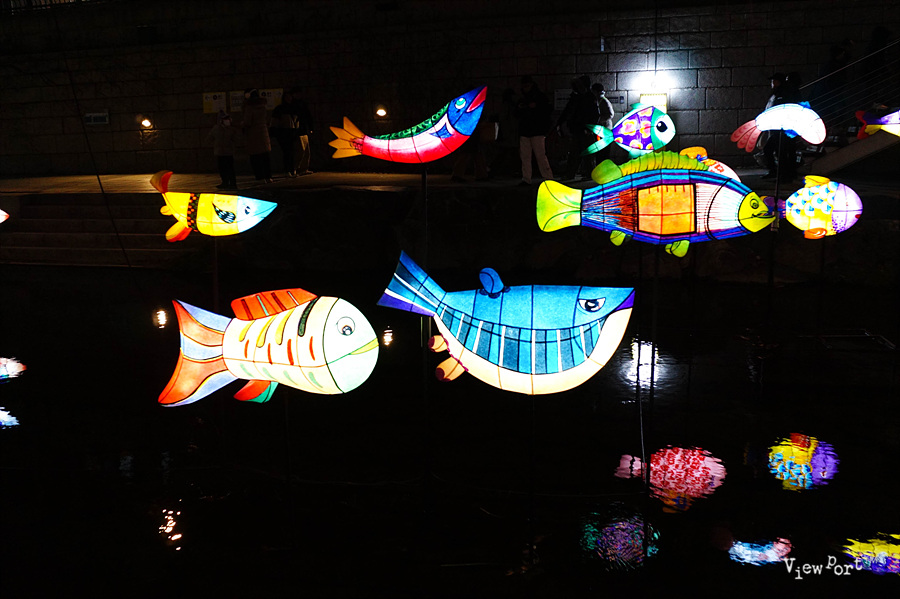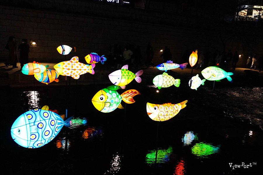 3구역은 광교에서 장통교 사이의 구간에 일상의 희락이라는 주제로 전통혼례 어사화 족두리등의 작품들이 전시되어 있고요 여행하는 물고기 때 등이 화려하게 빛을 바라고 있습니다.