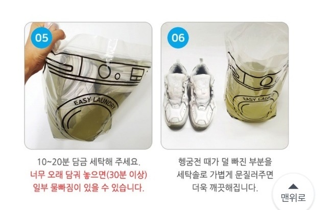 운동화를 넣고 몇 번 흔들어서 기포를 내준 다음에 2 ~ 30분 동안만 그냥 두면 운동화에 찌든 때들이 빠지는 방식이었어요.