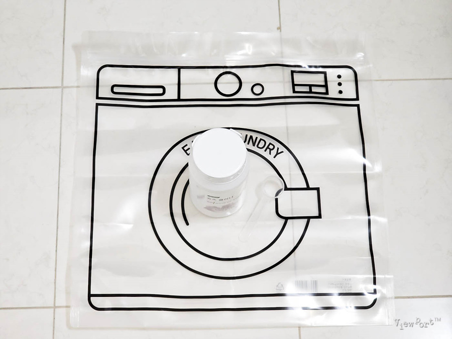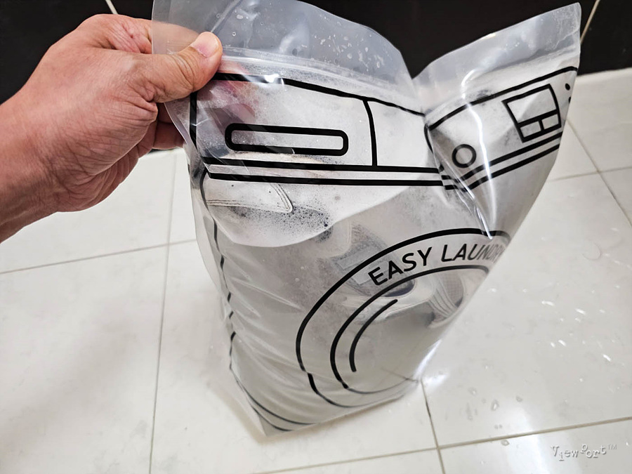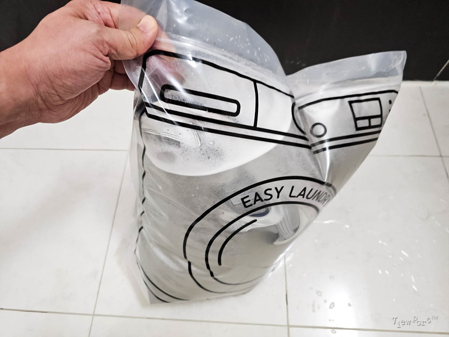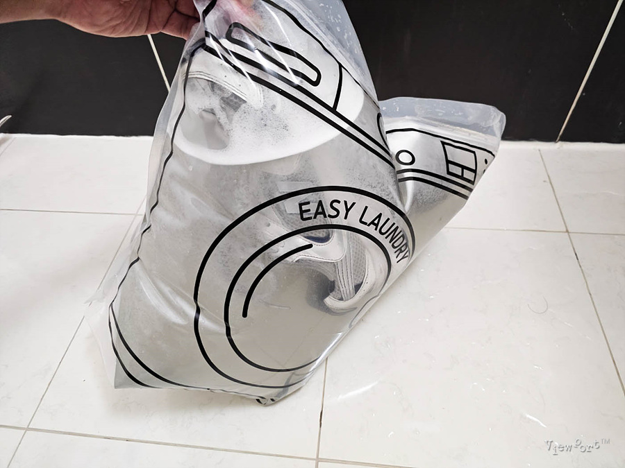 지퍼팩에 세제와 운동화 그리고 물을 넣고 지퍼팩을 닫아 줬습니다.