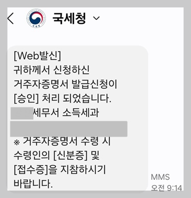 다음날 신청한 거주자 증명서 발급 신청이 승인 처리되었다는 문자를 받았습니다.