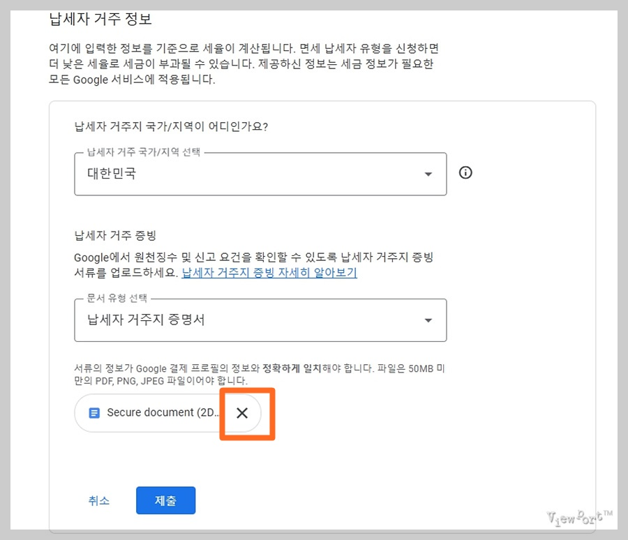 기존에 등록되어 있던 첨부 파일을 삭제하고 새로 발급받은 납세자 거주지 증명서 PDF 파일을 업로드 해 주고,