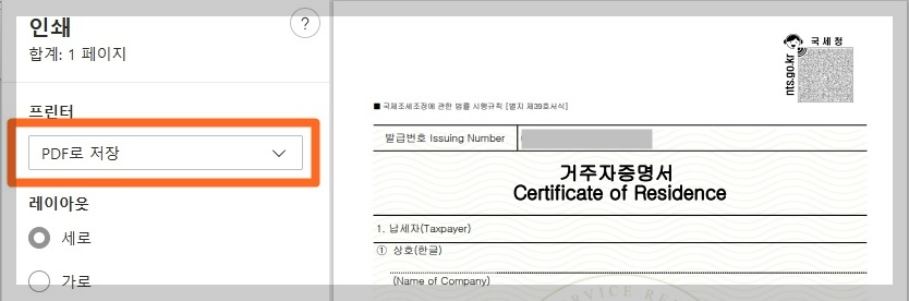 이렇게 하면 거주자 증명서 파일을 프린터로 출력하지 않고 PDF 파일로 저장할 수 있게 됩니다