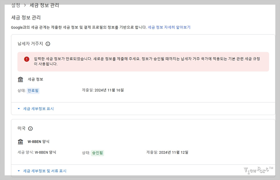 애드센스 미국 세금정보 업데이트하기 Google Payments: 세금 정보가 2024년 12월 31일에 만료됩니다뷰포트의 작은 창 밖 세상 / Viewport얼마 전 구글로부터 아래와 같은 메일을 받았습니다.세금 정보가