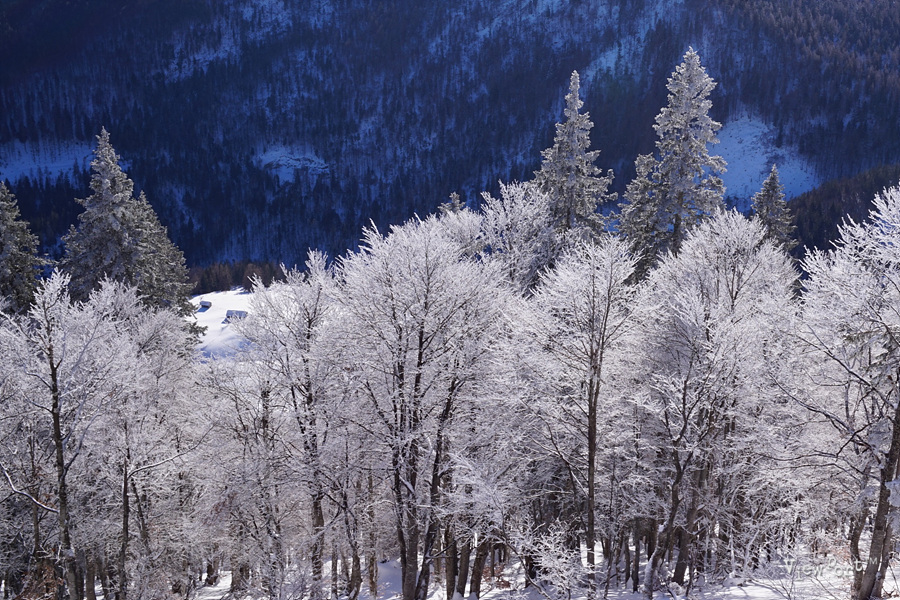 이 사진의 경우에는 하얀 눈이 덮인 나무와 뒤편의 숲이 색상 대비가 되면서 비교적 원거리 사진이지만 표현이 잘 되었는데요