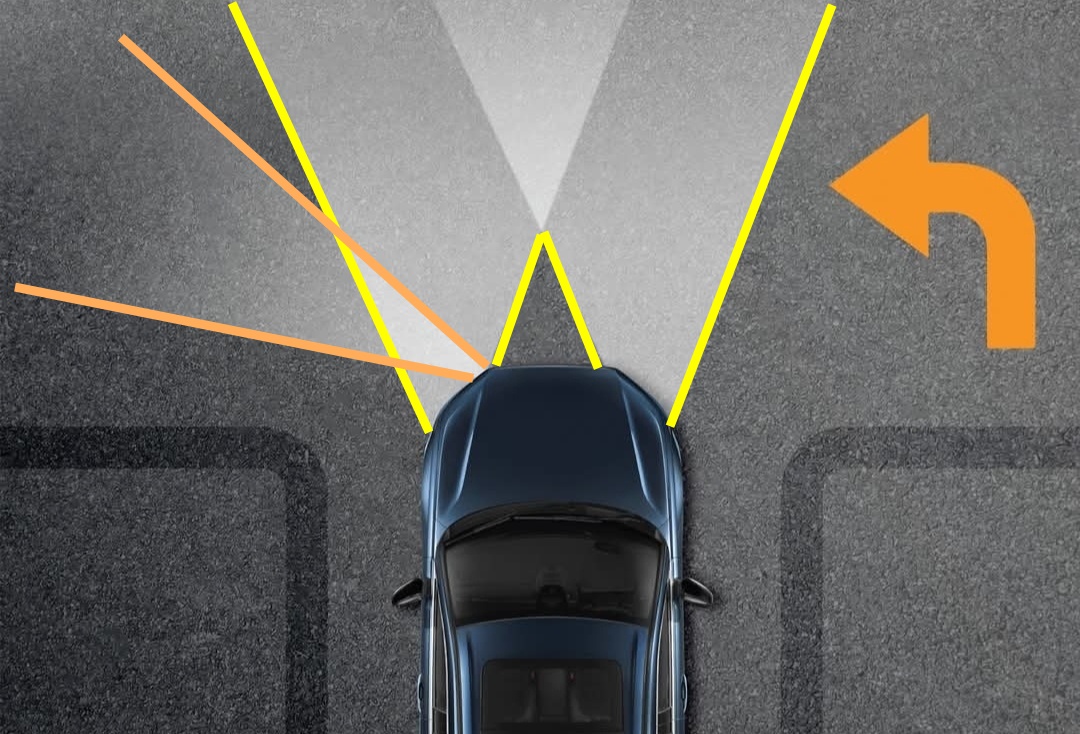 위 그림은 좌회전 하는 차량을 그린건데요, 직진방향의 노란색 전조등외에 좌회전시 주황색 방향의 전조등이 켜지면 회전방향으로도 시야가 확보될 수 있습니다.