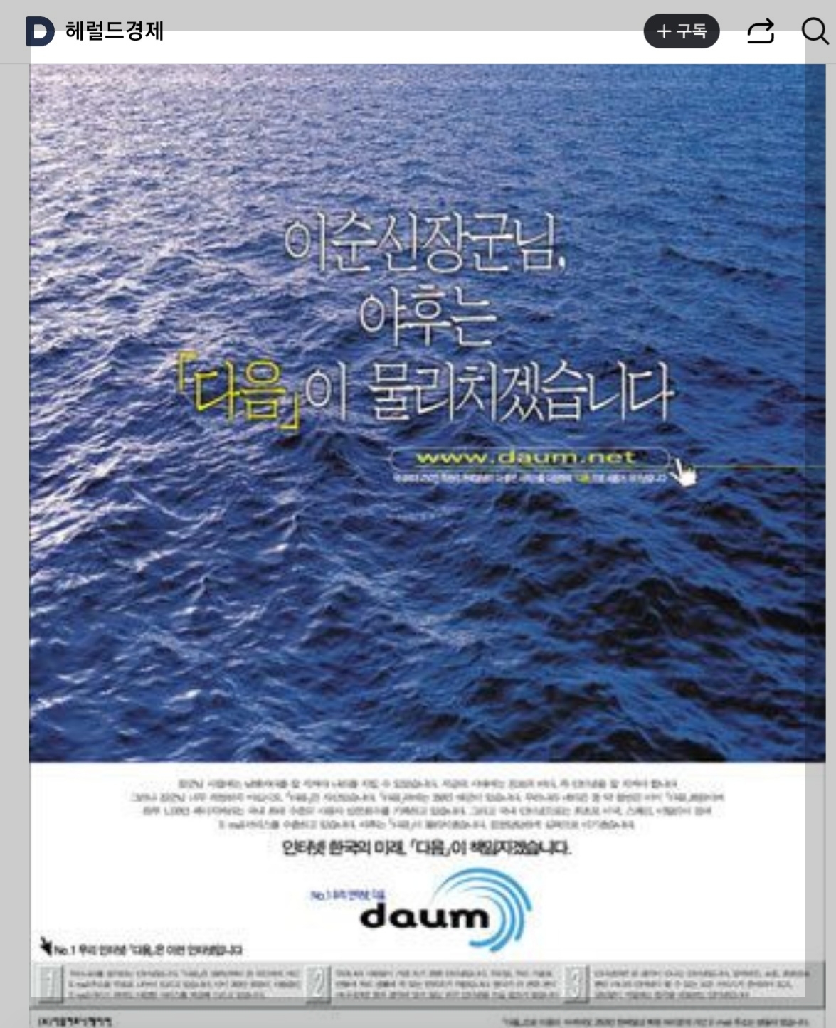 [헤럴드경제=고재우 기자] “이순신 장군님, 야후는 ‘다음’이 물리치겠습니다.” (다음 광고 문구 중) ‘20여년’ 전 도발적인 광고 문구 같은 분위기는 더 이상 없다. 한때 검색엔진 시장 최강