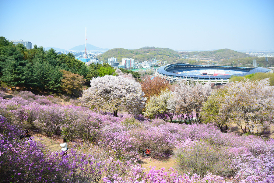 곳곳에 전망대가 있고, 맨 윗쪽 전망대에서는 부천 종합운동장이 예쁜 진달래꽃들에 싸여 있는 듯한 모습을 볼 수 있구요, 다만 사람들이 많이 몰리면 한길로 다녀야 하기때문에 중간 중간에 멈춰서 사진을 찍기 미안할때가 있습니다.