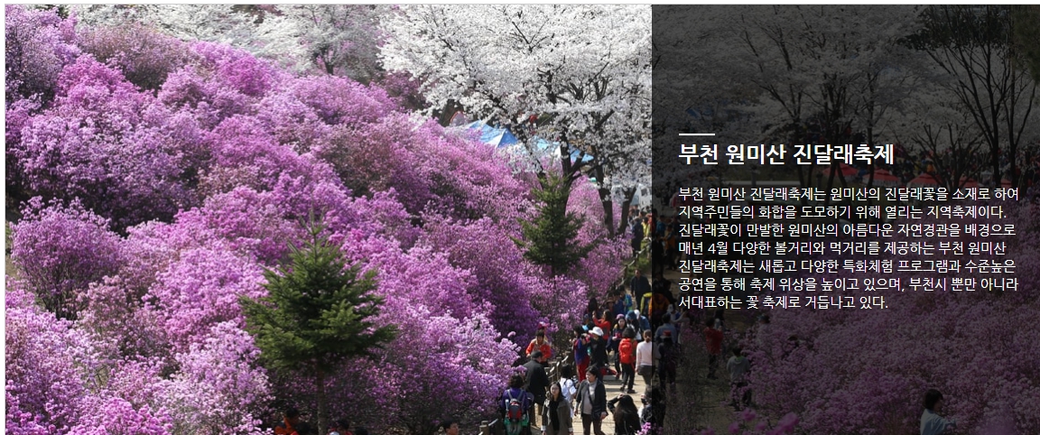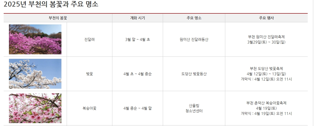 위에 보시는 내용들이 부천시청 홈페이지에 소개된 원미산 진달래 축제를 비롯한 부천시 봄꽃 축제 현황을 알리는 내용인데요, 산불 재난 위기로 인해 축제 개최여부에 관한 내용들이 아직 반영하지 못하고 있습니다.