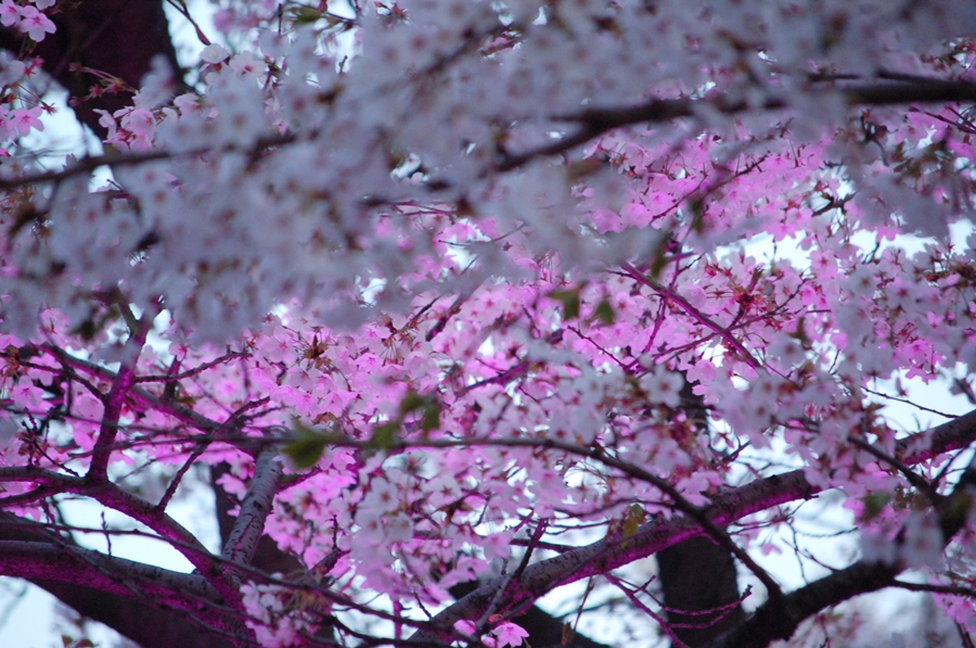 늦은 시간 조명이 예쁘게 비춘 벚꽃과 함께