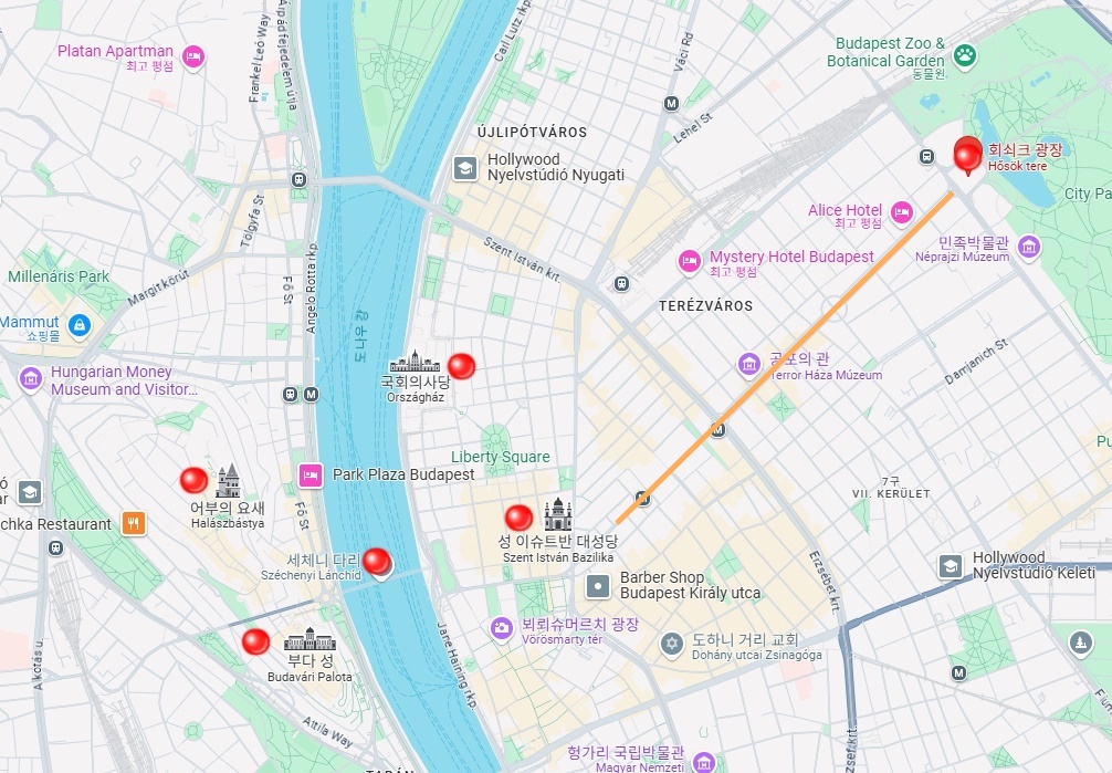 부다페스트의 주요 관광지들이 모여 있는 다뉴브강가에서 좀 떨어진 곳에 있습니다.