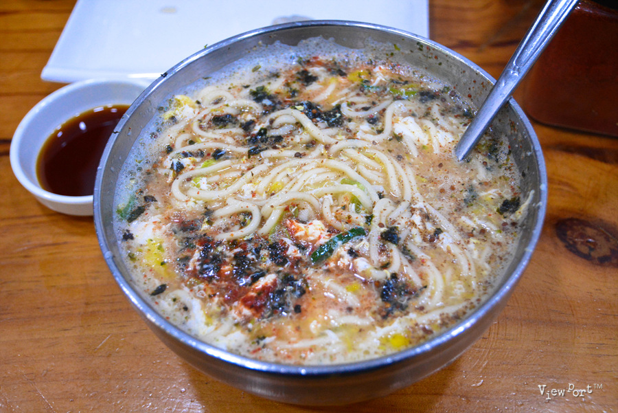 칼국수 위에 통들깨와 김가루 고춧가루가 얹어 나오는게 일반 칼국수와도 좀 다르고 전분이 살짝 풀린 것처럼 눅진한 국물이 중국집의 기스면 같은 느낌이고요 마치 기계 우동 국수 같은 동글동글하고 탱글탱글한 면이 이 집의 특징입니다.