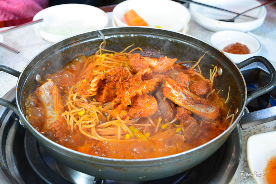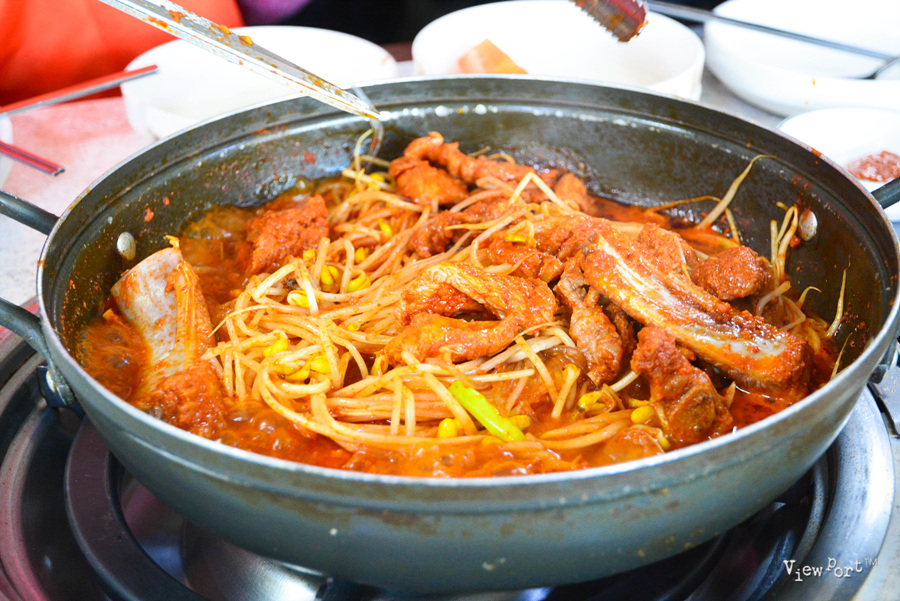 전골처럼 자작한 국물 위에 당면 사리가 올라오는데요 끓고 나면 뒤집어서 고기를 먼저 자르고 당면 사리를 먹고, 이후에 자작하게 졸여진 고기를 먹는 방식입니다.