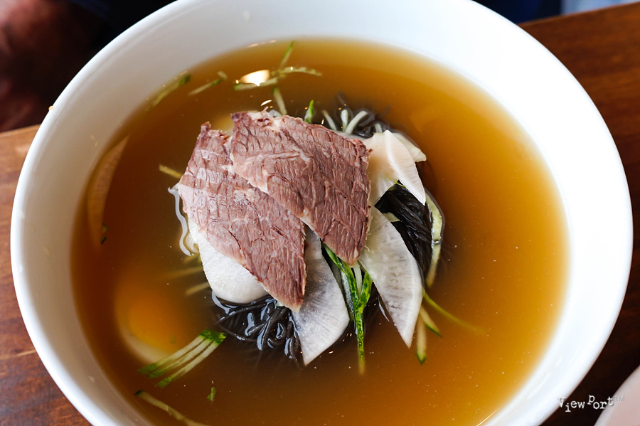 언뜻 보면 명태회냉면은 단천냉면과 비슷해 보이는데요, 잘 보시면 국물이 맑은 물입니다.