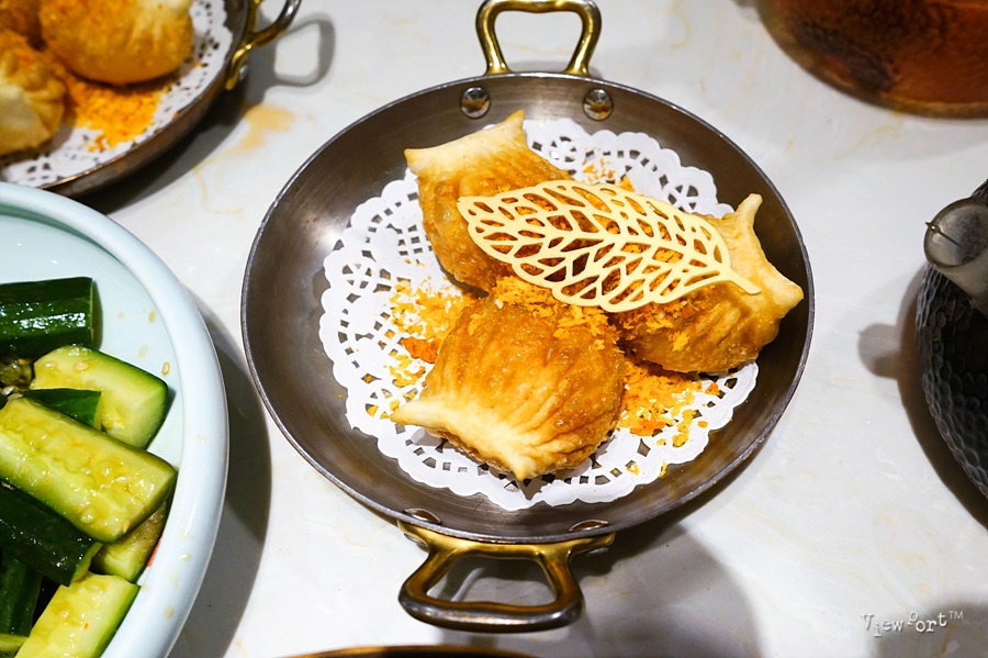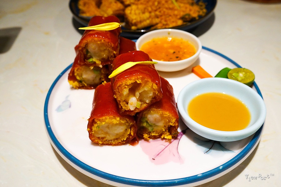 겉은 홍미로 만들어 붉고 찹쌀피 같은 느낌이고 안에는 바삭한 맛과 새우가 꽉 차, 맛이 정말 맛있습니다.