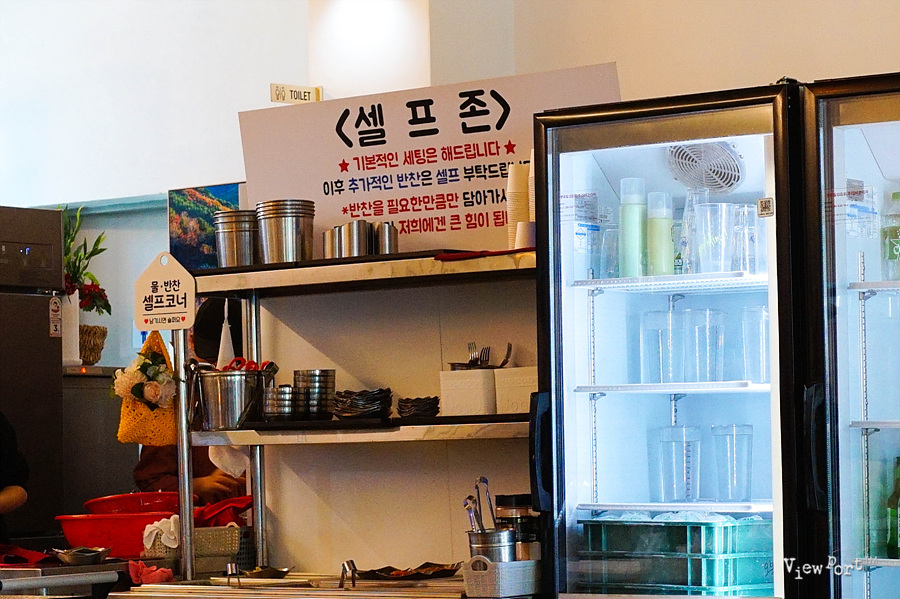 먼저 밑반찬이 나오는데 물과 반찬 셀프 코너가 있어서 추가로 가져다 먹을 수 있어요