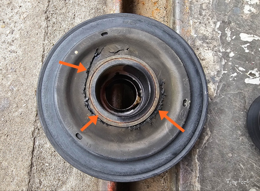 정비소 사장님께서 설명해 주시기로는 디젤 차에서만 주로 발생하는 문제로, 디젤차는 진동이 심하기 때문에 가솔린 차 대비 댐퍼 풀리에 저 고무 부분이 유난히 더 두껍다고 합니다.