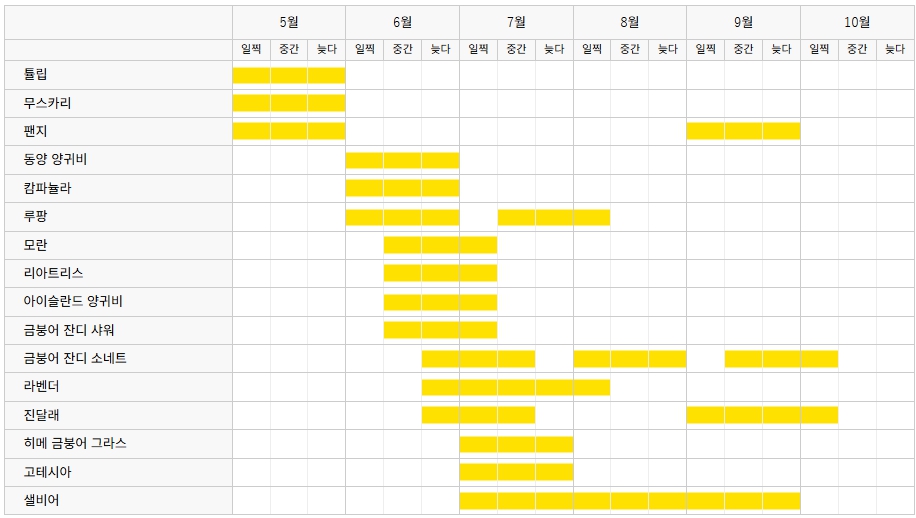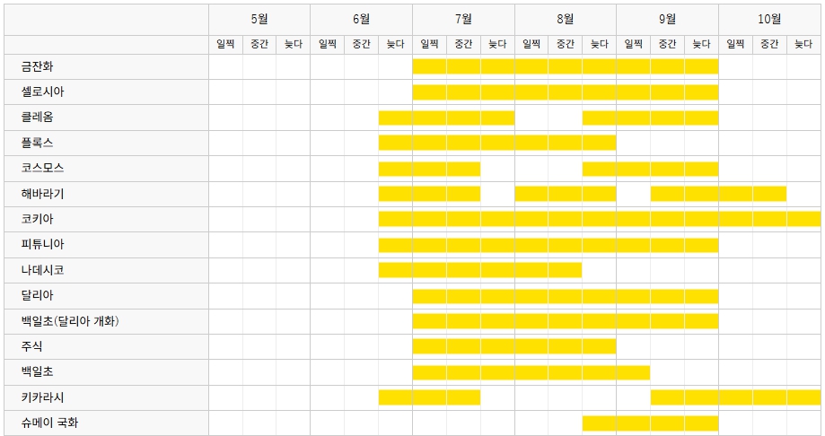 6월 말부터 8월 초까지 품종이 다른 꽃들을 심어서 지속적으로 꽃을 볼 수 있습니다.