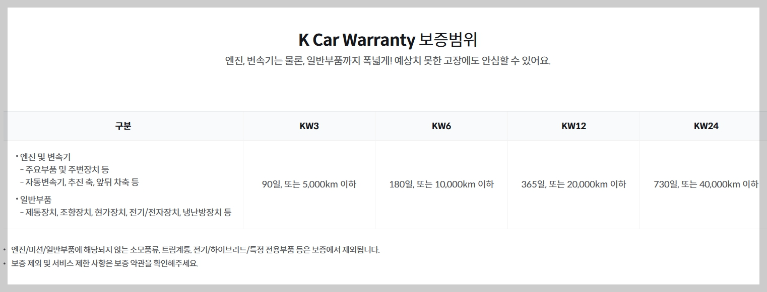 3. K카 (케이카) 워런티를 통해 자동차 메이커의 보증 기간이 끝난 차의 경우 6개월 단위로 보증 보험을 들 수 있습니다.