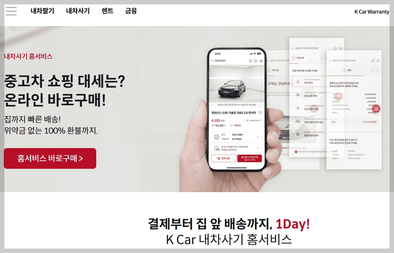 요즘은 다른 사이트에도 비교적 많이 적용되고 있는 홈서비스는 온라인에서 자동차를 구매하면 집까지 차량 배송을 받을 수 있고요. 3일 동안 차를 타 보고 구매 여부를 결정하면 됩니다 (엔카의 3일타기랑 비슷한데 케이카에서 제일 먼저 시작했음).