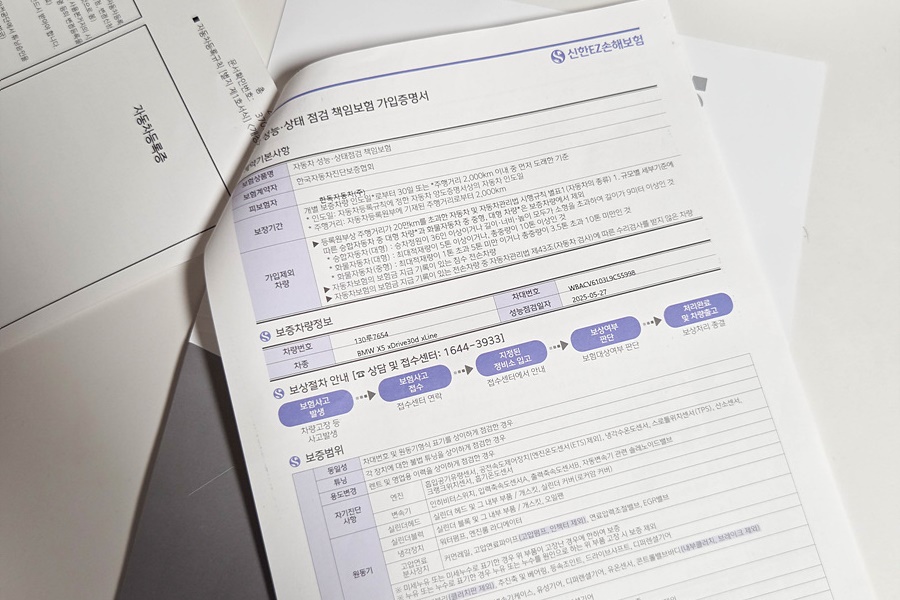 중고차다보니 구매 당시에는 문제가 없더라도 이후에 문제가 생길 수 있는데요, 차량 구입 후 한 달 또는 2000km 이내 주행 전에 차량을 재검수해서 기존 성능 평가 표에서 문제가 없었던 부분에 하자가 발생하면 성능평가표에 적힌 보험사를 통해 무상 수리를 받을 수 있습니다. 저도 한 달이 지나는 시점에 엔진오일 교체하며 차량 검수를 다시 했습니다.