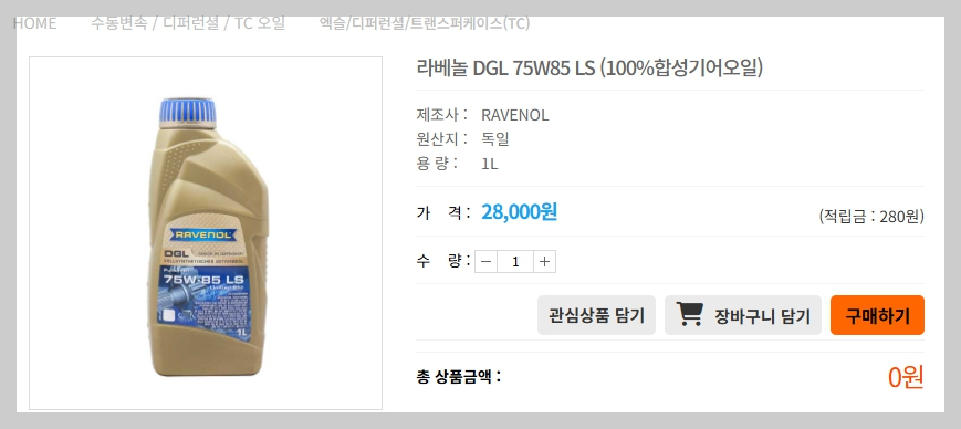 2. 전륜 디퍼런셜오일 : 라베놀 DGL 75W85LS ( Ravenol DGL 75W85LS ) 1통 - 28,000원