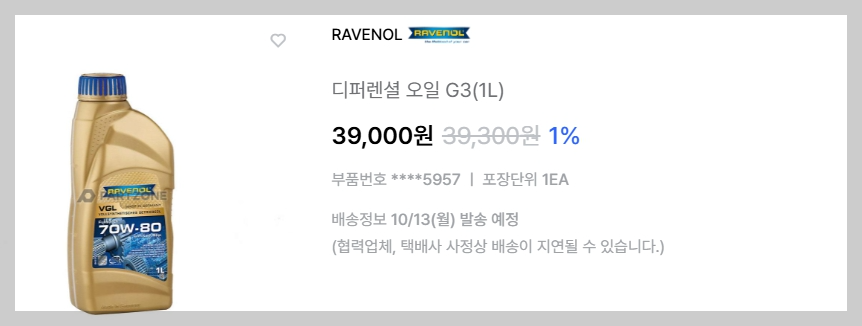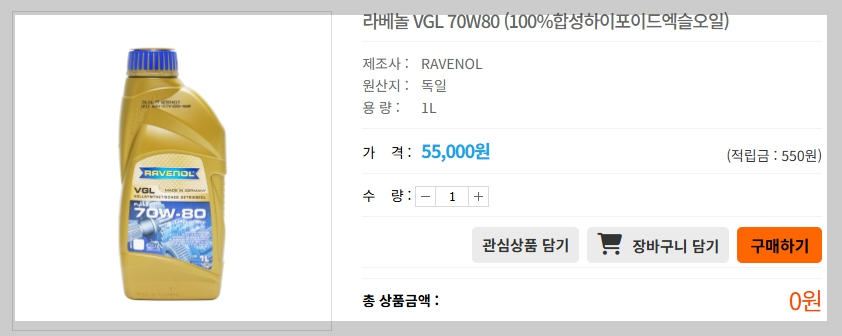 3. 후륜 디퍼런셜오일 : 라베놀 VGL 70W80 ( Ravenol VGL 70W80 ) 2통 - 39,000원 x2 = 78,000원