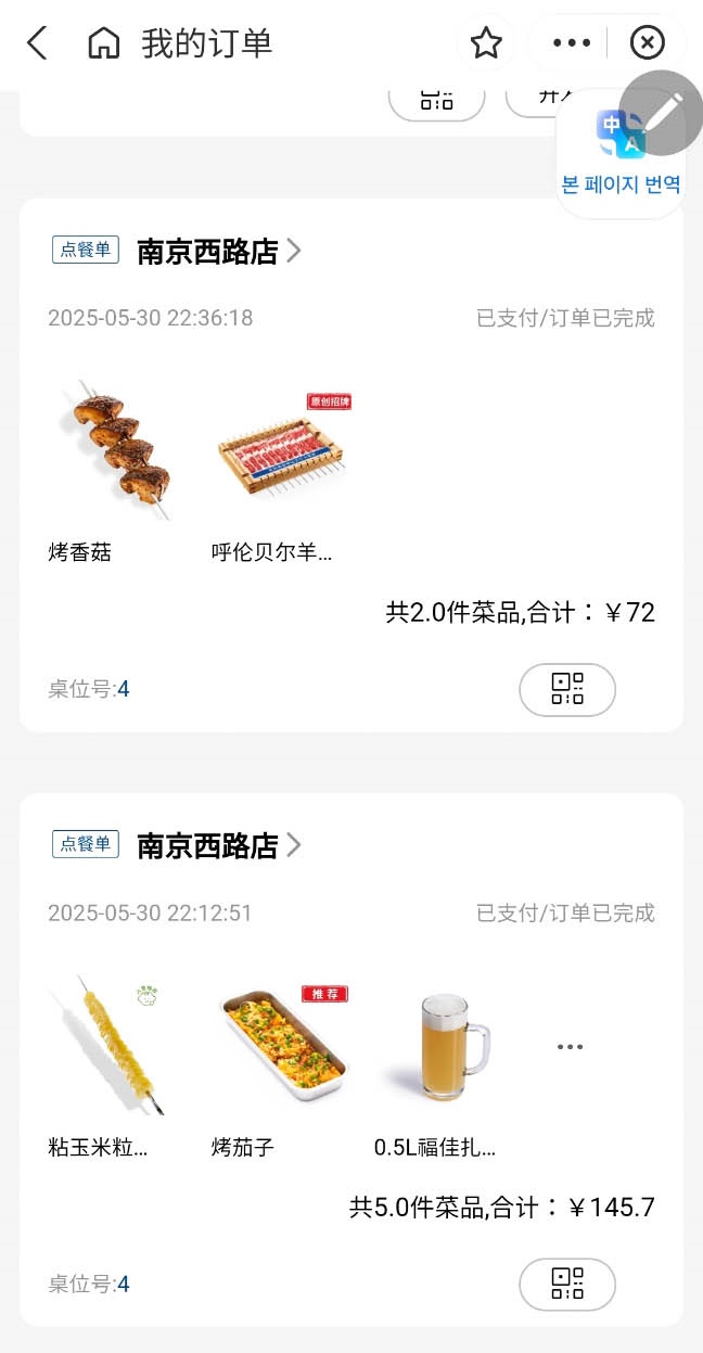 주문은 테이블에 있는 QR 코드를 찍어서 알리페이와 연동해 메뉴를 주문할 수 있고요